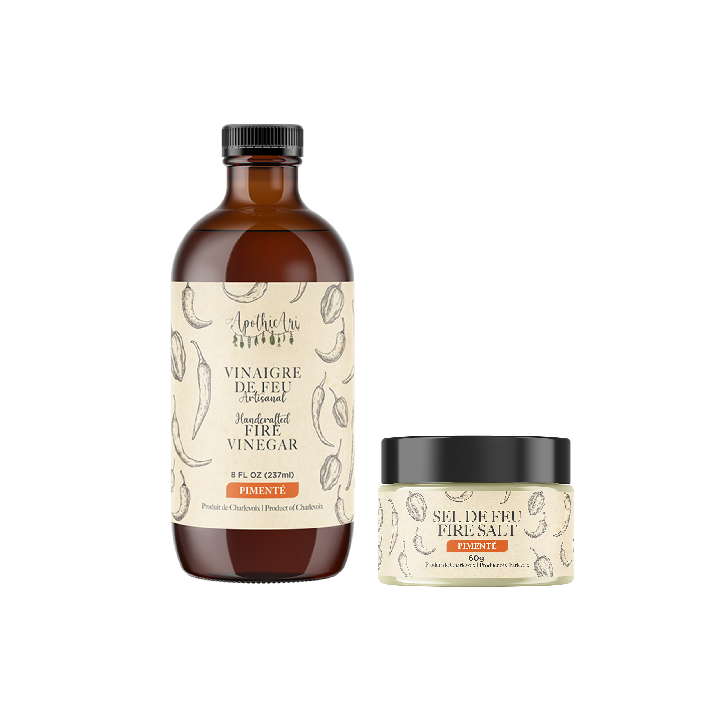 Voici un duo parfait pour découvrir nos produits! Nous vous offrons la possibilité de choisir la taille de votre bouteille de Vinaigre de feu, ainsi que votre préférence entre les Épices et le Sel de feu. Bonne dégustation!