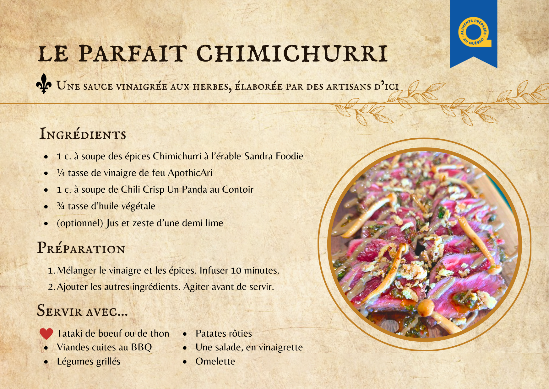 La boîte inclut également une fiche recette détaillée pour préparer votre sauce chimichurri à la maison, ainsi que des suggestions d’utilisation pour prolonger le plaisir.